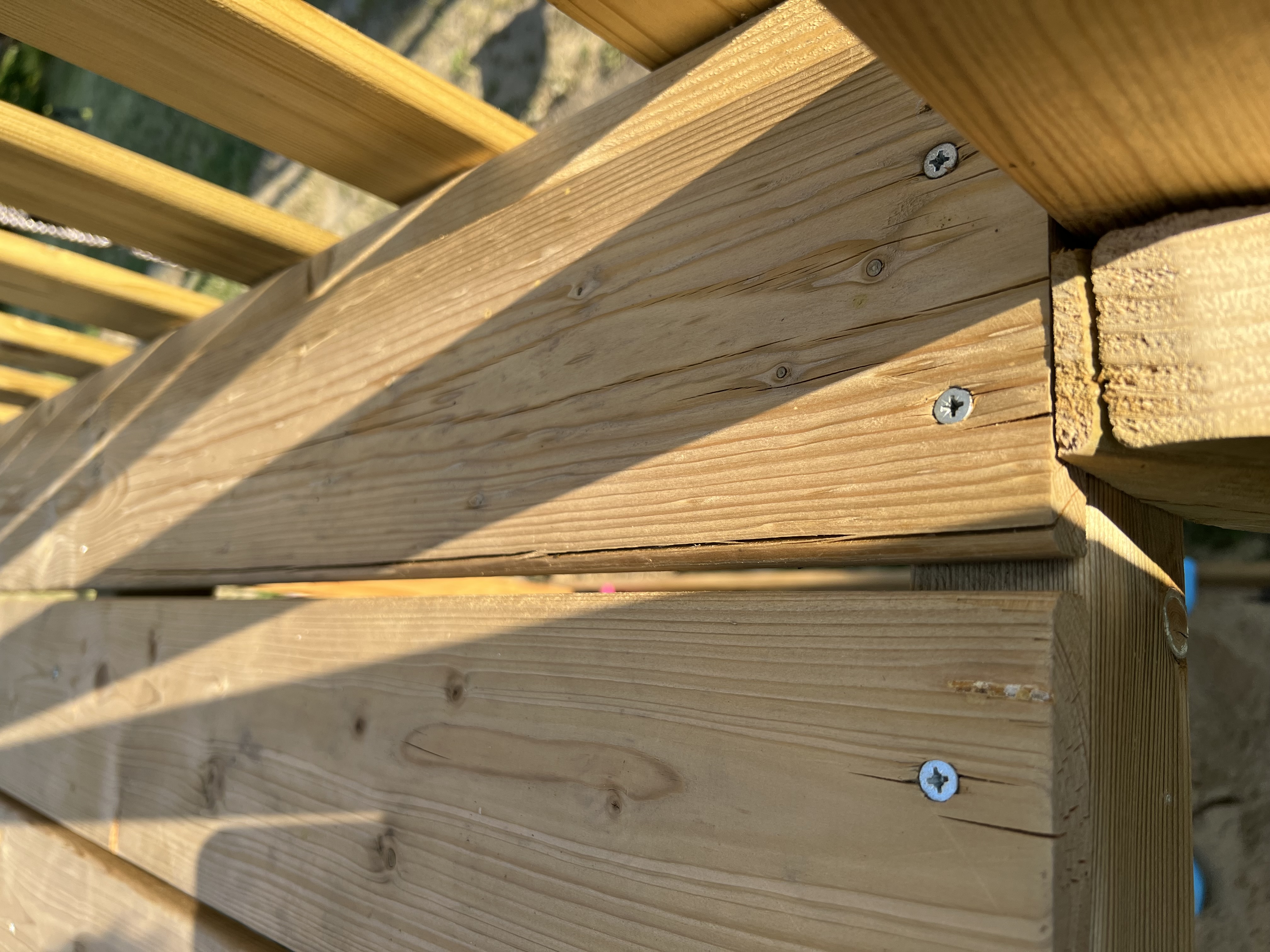 Once the wood of your climbing frame has dried, we recommend pre-drilling holes before screwing in the screws. This minimises the risk of cracks appearing. This also prevents the alloy of the screws from being damaged and helps to avoid premature rusting.