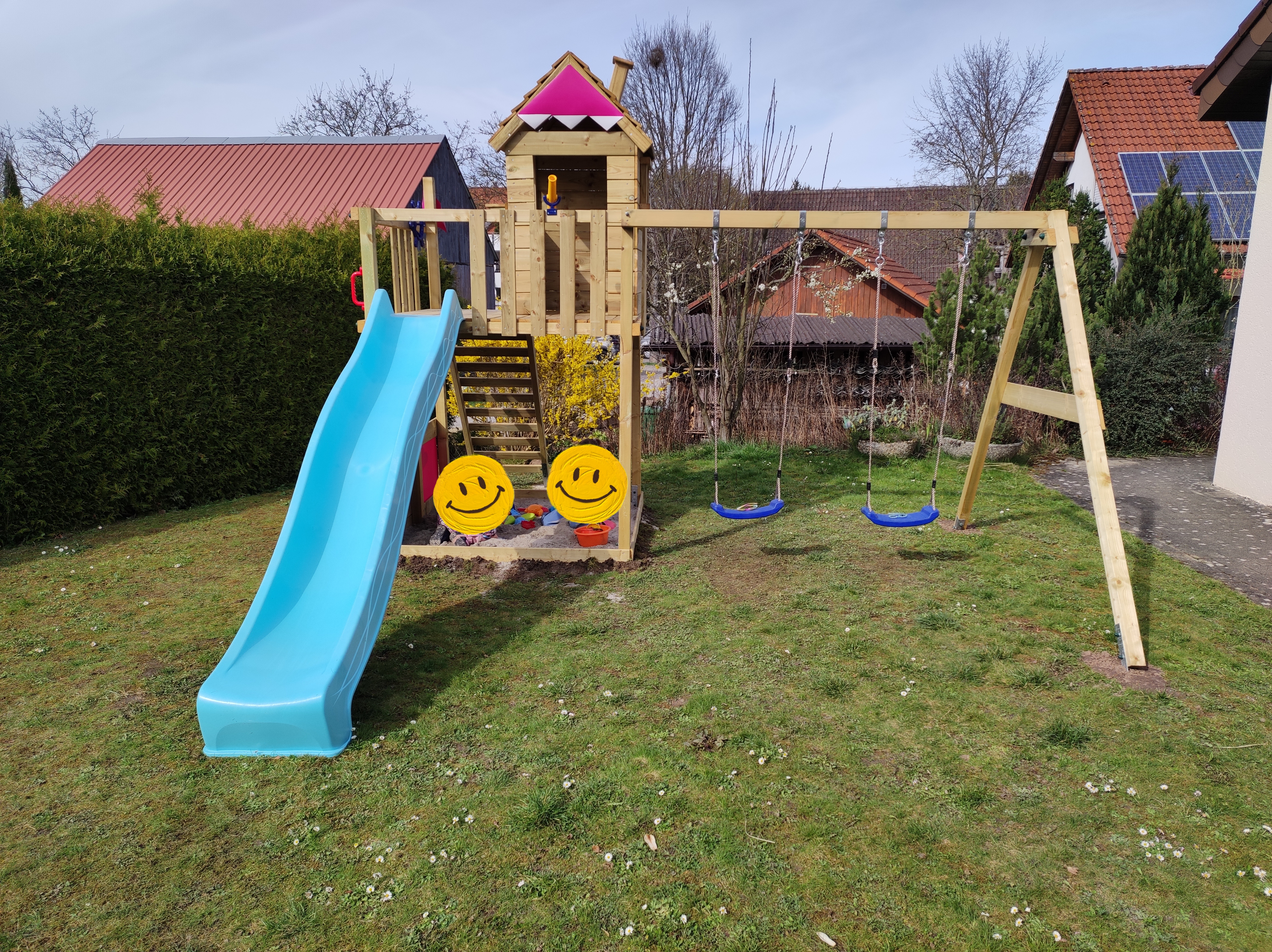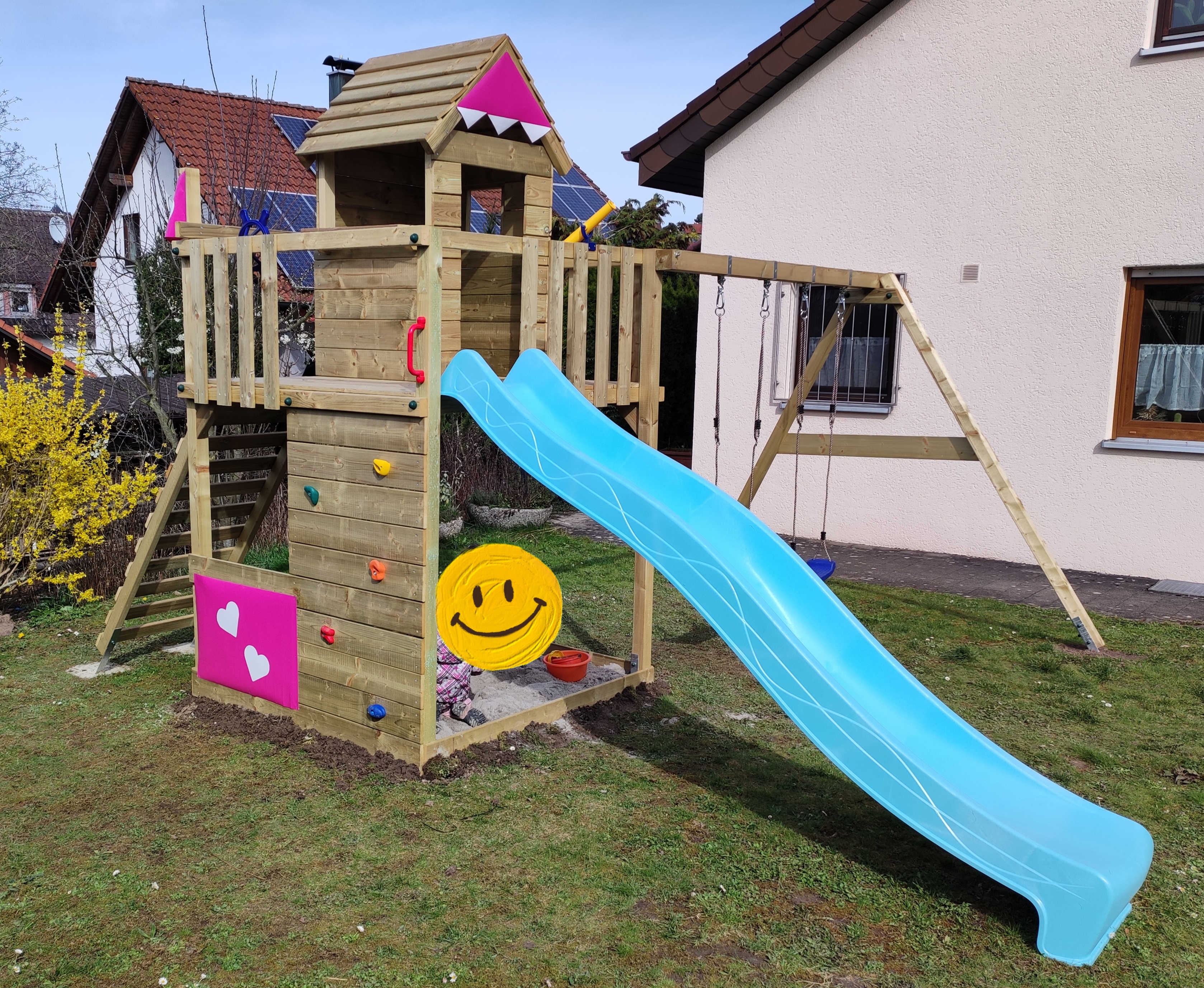 Choose the right slide and tarpaulin for your climbing frame from a variety of bright colours. If you want, you can also give the climbing frame a creative coat of paint (paints that are certified according to DIN EN 71 Part 3 are safe for children and the environment).