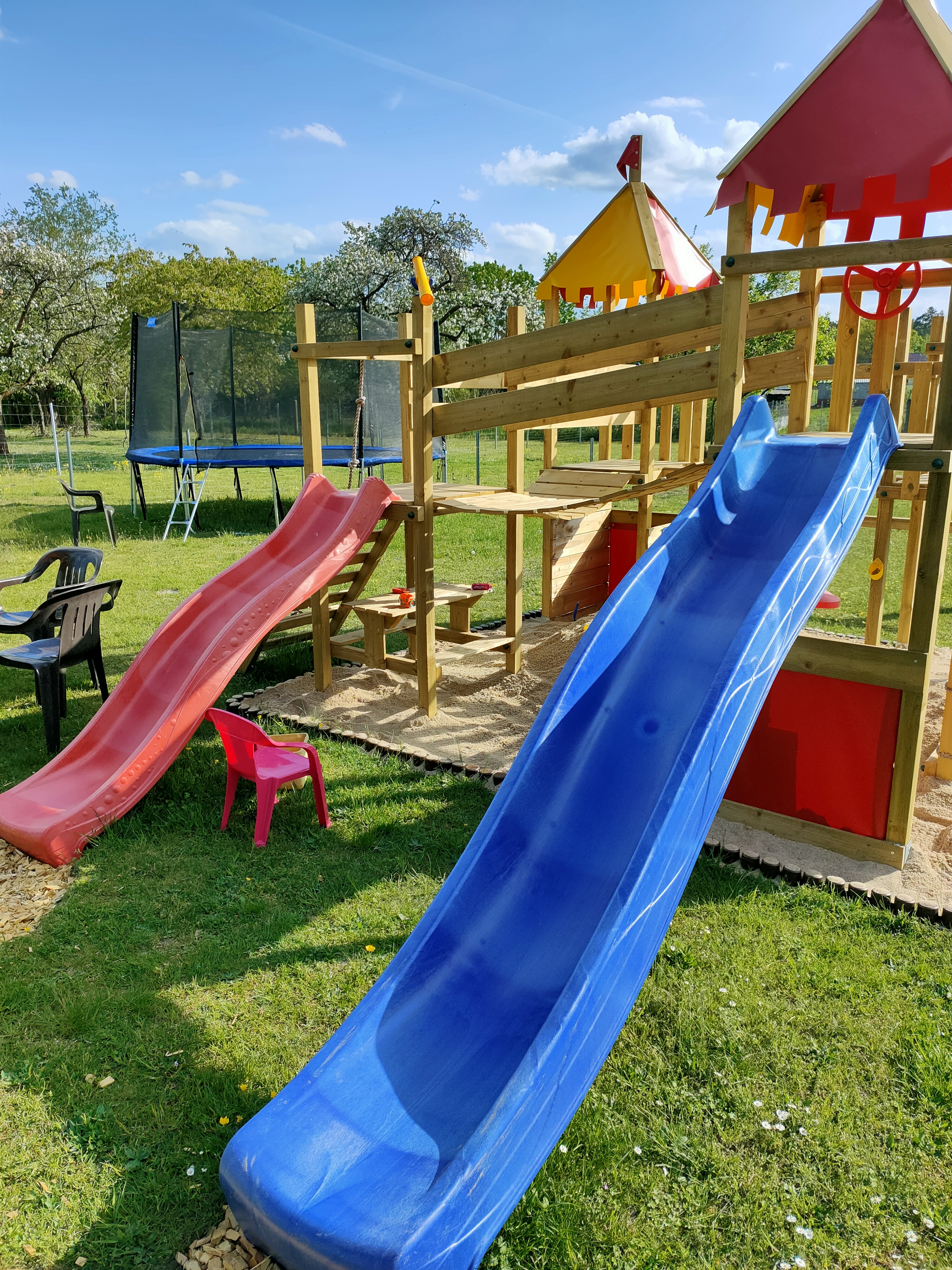 Choose the right slide and tarpaulin for your climbing frame from a variety of bright colours. If you want, you can also give the climbing frame a creative coat of paint (paints that are certified according to DIN EN 71 Part 3 are safe for children and the environment).