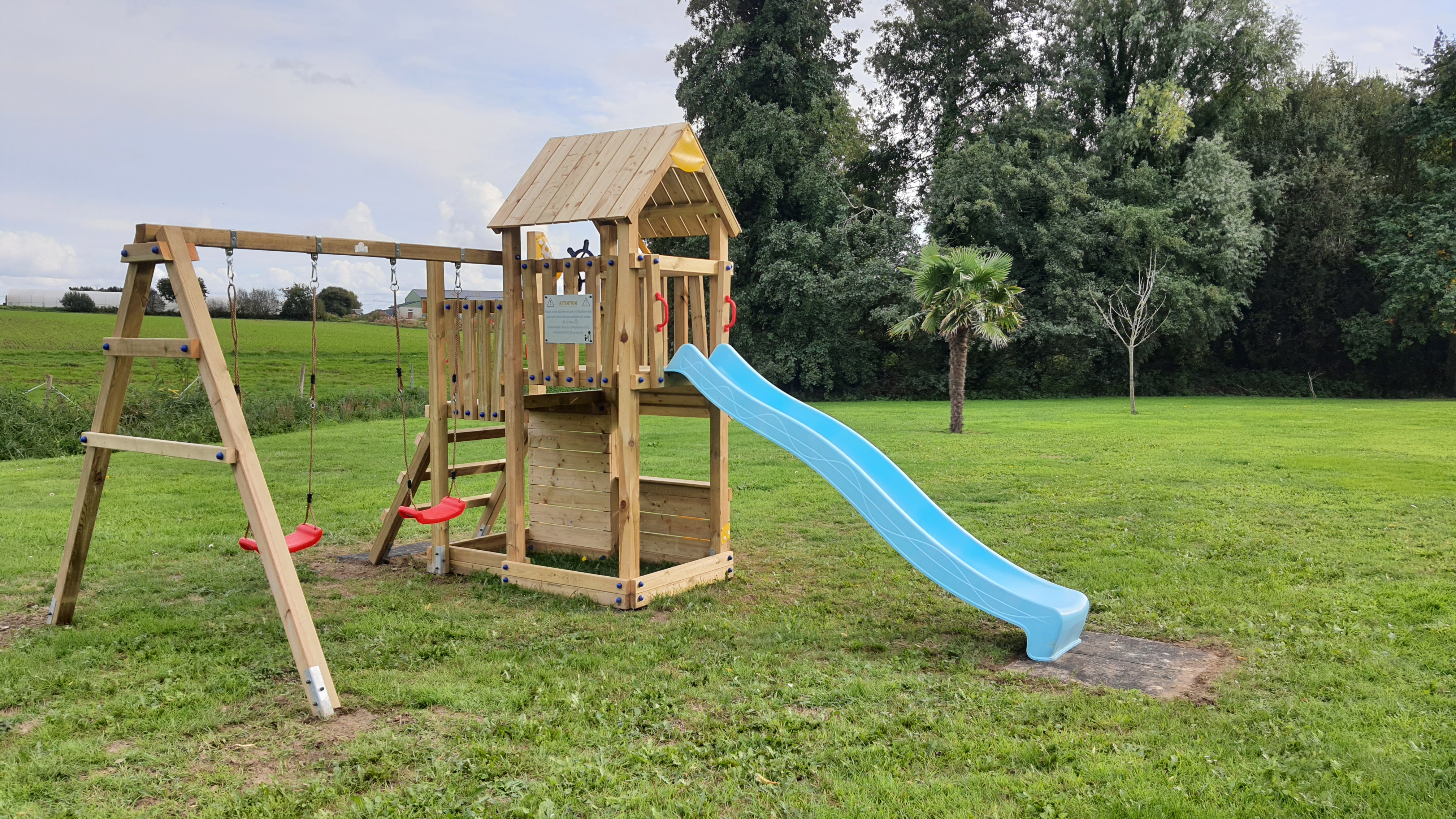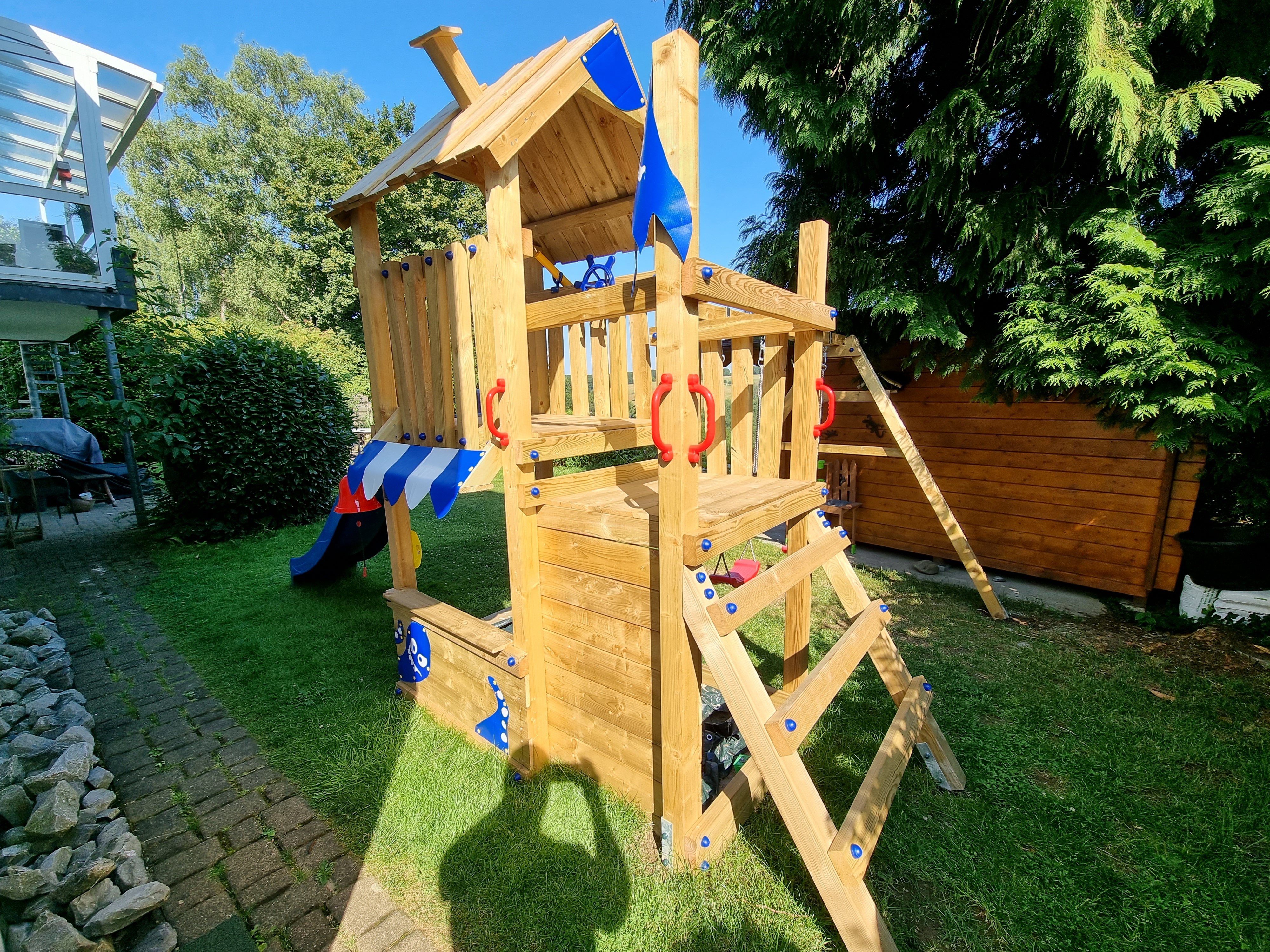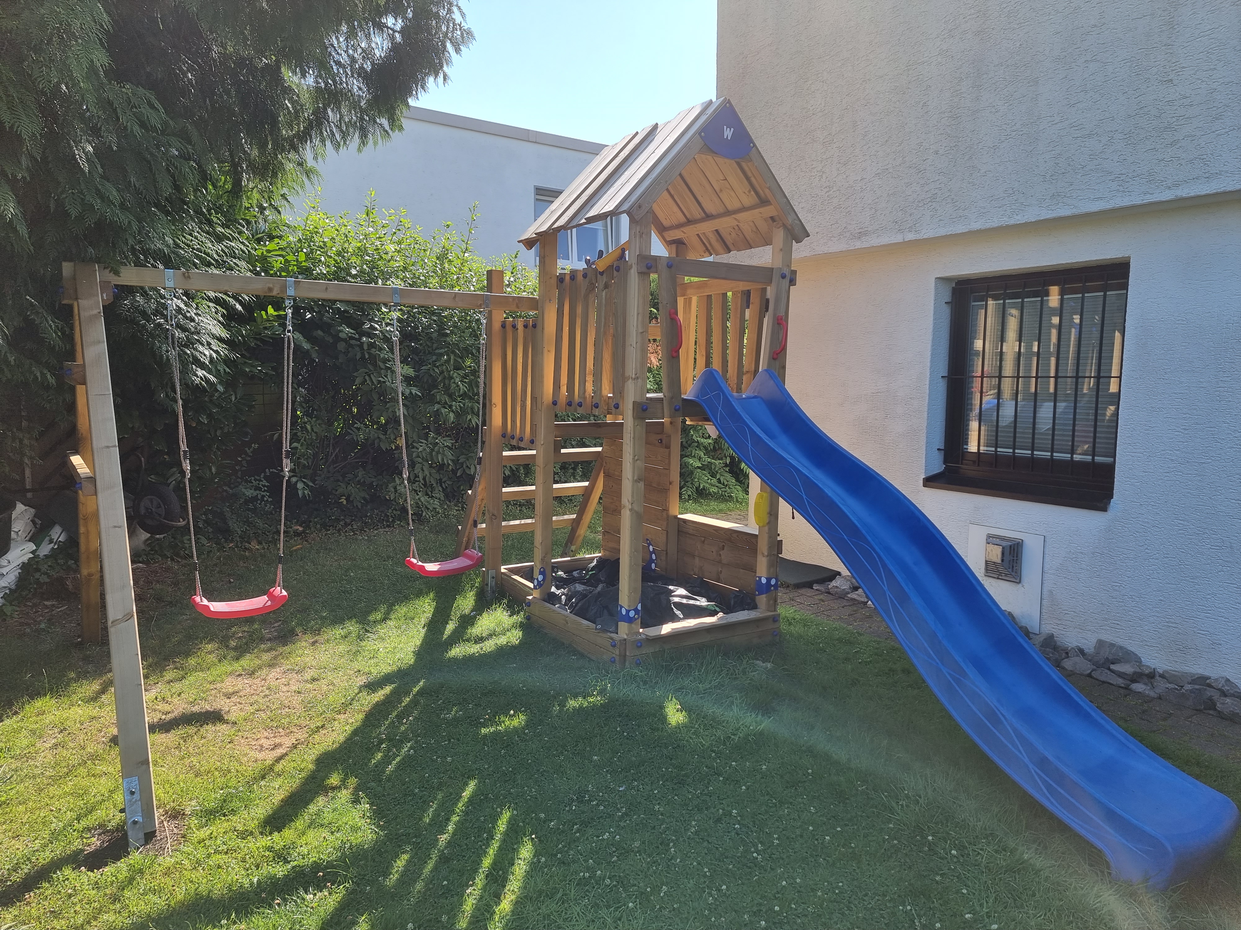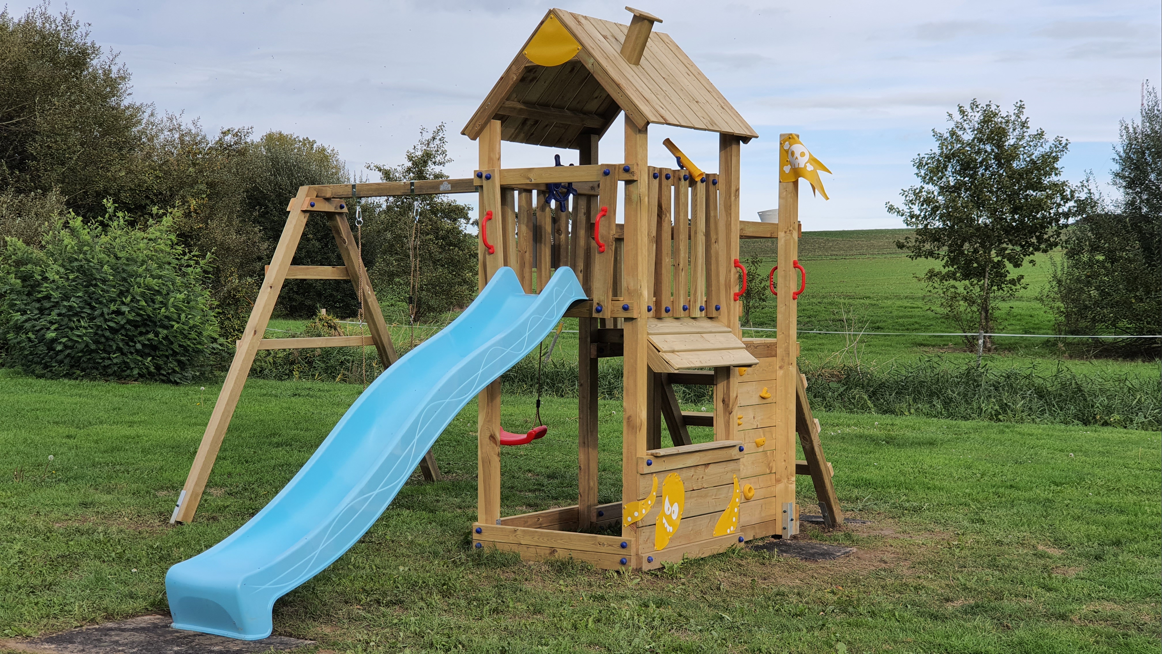 Choose the right slide and tarpaulin for your climbing frame from a variety of bright colours. If you want, you can also give the climbing frame a creative coat of paint (paints that are certified according to DIN EN 71 Part 3 are safe for children and the environment).
