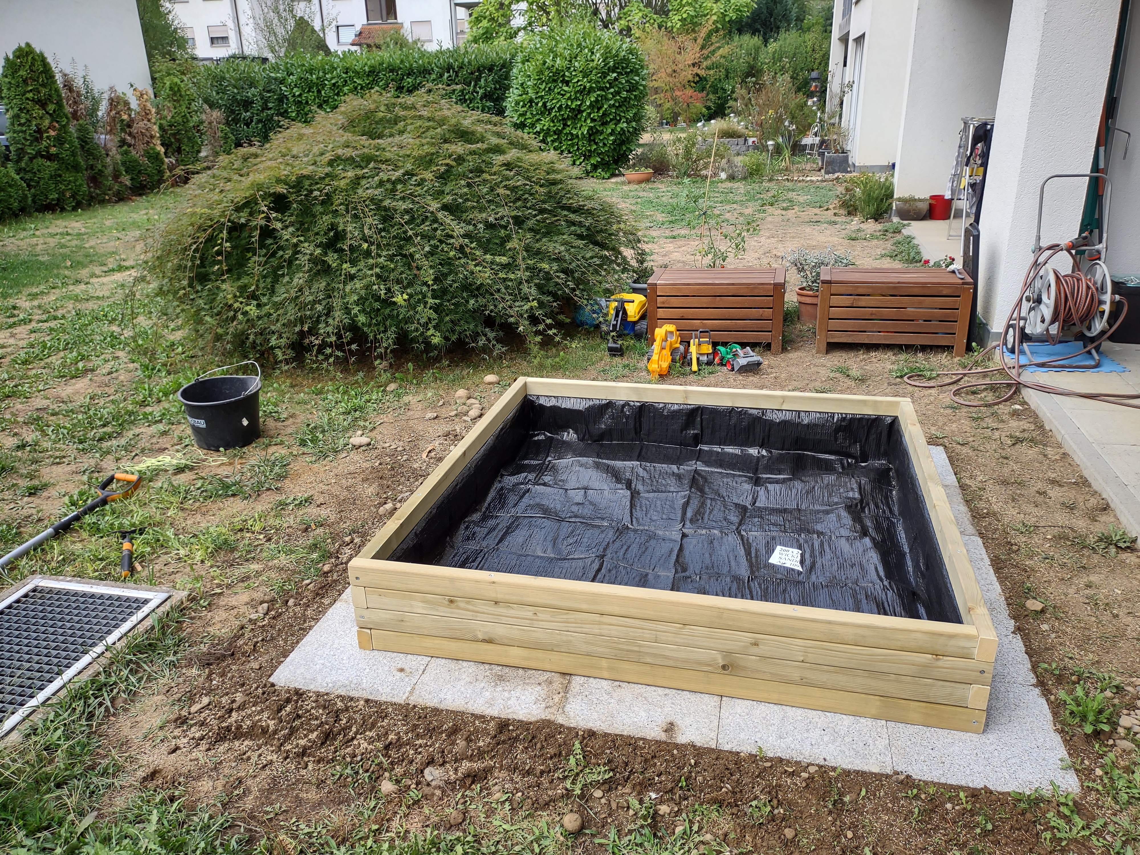The sandpit kit consists of beams, boards, installation material and assembly instructions.